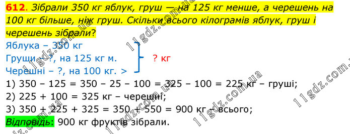 Зібрали 350 кг яблук, груш — на 125 кг менше, а черешень на 100 кг більше, ніж груш. Скільки всього кілограмів яблук, груш і черешень зібрали? Яблука – 350 кг Груши – ?, на 125 кг м. ? кг Черешні – ?, на 100 кг. > 1) 350 – 125 = 350 – 25 – 100 = 325 – 100 = 225 кг – груші; 2) 225 + 100 = 325 кг – черешні; 3) 350 + 225 + 325 = 350 + 550 = 900 кг – всього; Відповідь: 900 кг фруктів зібрали.