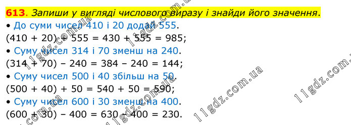 Запиши у вигляді числового виразу і знайди його значення. • До суми чисел 410 і 20 додай 555. (410 + 20) + 555 = 430 + 555 = 985; • Суму чисел 314 і 70 зменш на 240. (314 + 70) – 240 = 384 – 240 = 144; • Суму чисел 500 і 40 збільш на 50. (500 + 40) + 50 = 540 + 50 = 590; • Суму чисел 600 і 30 зменш на 400. (600 + 30) – 400 = 630 – 400 = 230.