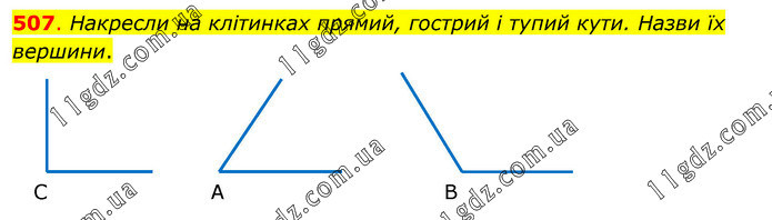Накресли на клітинках прямий, гострий і тупий кути. Назви їх вершини.