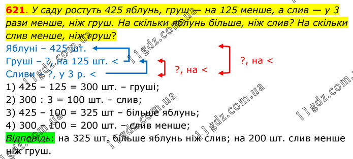 У саду ростуть 425 яблунь, груш — на 125 менше, а слив — у 3 рази менше, ніж груш. На скільки яблунь більше, ніж слив? На скільки слив менше, ніж груш? Яблуні – 425 шт. Груші – ?, на 125 шт. < Сливи – ?, у 3 р. < 1) 425 – 125 = 300 шт. – груші; 2) 300 : 3 = 100 шт. – слив; 3) 425 – 100 = 325 шт – більше яблунь; 4) 300 – 100 = 200 шт. – слив менше; Відповідь: на 325 шт. більше яблунь ніж слив; на 200 шт. слив менше ніж груш.