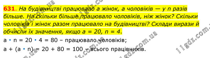 На будівництві працювало а жінок, а чоловіків — у n разів більше. На скільки більше працювало чоловіків, ніж жінок? Скільки чоловіків і жінок разом працювало на будівництві? Склади вирази й обчисли їх значення, якщо а = 20, n = 4. a ∙ n = 20 ∙ 4 = 80 – працювало чоловіків; a + (a ∙ n) = 20 + 80 = 100 – всього працівників.
