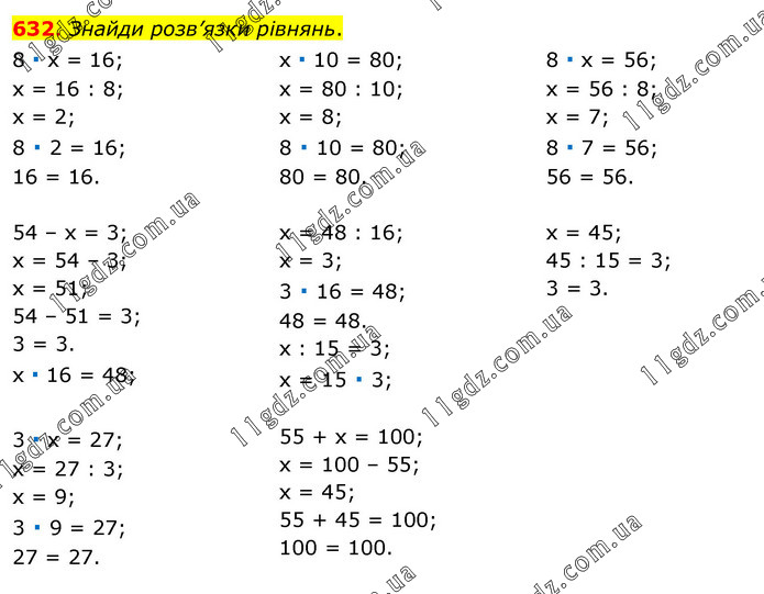Знайди розв’язки рівнянь. 8 ∙ х = 16; х = 16 : 8; х = 2; 8 ∙ 2 = 16; 16 = 16. х ∙ 10 = 80; х = 80 : 10; х = 8; 8 ∙ 10 = 80; 80 = 80. 8 ∙ х = 56; х = 56 : 8; х = 7; 8 ∙ 7 = 56; 56 = 56. 54 – х = 3; х = 54 – 3; х = 51; 54 – 51 = 3; 3 = 3. х ∙ 16 = 48; х = 48 : 16; х = 3; 3 ∙ 16 = 48; 48 = 48. х : 15 = 3; х = 15 ∙ 3; х = 45; 45 : 15 = 3; 3 = 3. 3 ∙ х = 27; х = 27 : 3; х = 9; 3 ∙ 9 = 27; 27 = 27. 55 + х = 100; х = 100 – 55; х = 45; 55 + 45 = 100; 100 = 100.