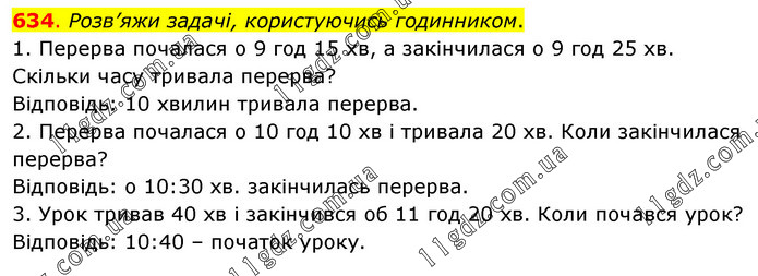 Розв’яжи задачі, користуючись годинником. 1. Перерва почалася о 9 год 15 хв, а закінчилася о 9 год 25 хв. Скільки часу тривала перерва? Відповідь: 10 хвилин тривала перерва. 2. Перерва почалася о 10 год 10 хв і тривала 20 хв. Коли закінчилася перерва? Відповідь: о 10:30 хв. закінчилась перерва. 3. Урок тривав 40 хв і закінчився об 11 год 20 хв. Коли почався урок? Відповідь: 10:40 – початок уроку.