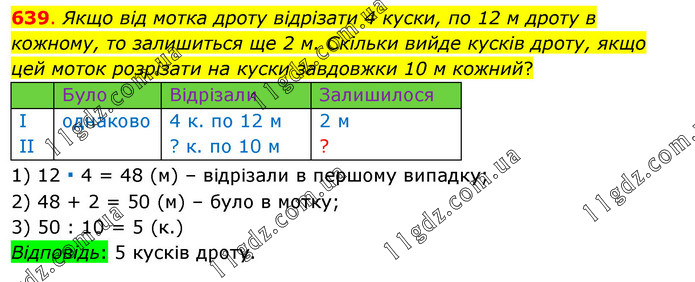 Якщо від мотка дроту відрізати 4 куски, по 12 м дроту в кожному, то залишиться ще 2 м. Скільки вийде кусків дроту, якщо цей моток розрізати на куски завдовжки 10 м кожний? 1) 12 ∙ 4 = 48 (м) – відрізали в першому випадку; 2) 48 + 2 = 50 (м) – було в мотку; 3) 50 : 10 = 5 (к.) Відповідь: 5 кусків дроту.