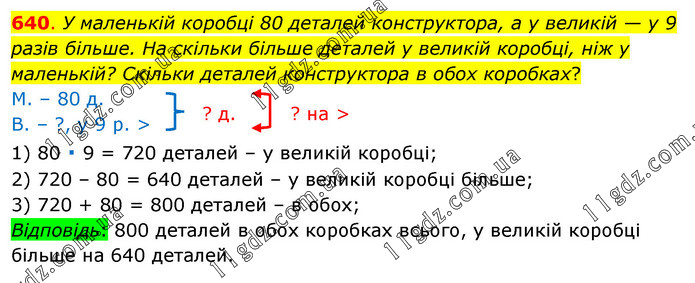 У маленькій коробці 80 деталей конструктора, а у великій — у 9 разів більше. На скільки більше деталей у великій коробці, ніж у маленькій? Скільки деталей конструктора в обох коробках? М. – 80 д. В. – ?, у 9 р. > 1) 80 ∙ 9 = 720 деталей – у великій коробці; 2) 720 – 80 = 640 деталей – у великій коробці більше; 3) 720 + 80 = 800 деталей – в обох; Відповідь: 800 деталей в обох коробках всього, у великій коробці більше на 640 деталей.