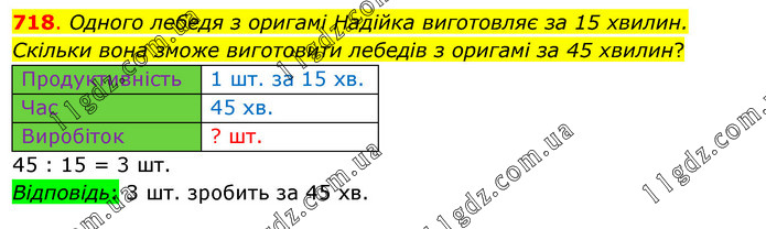 Одного лебедя з оригамі Надійка виготовляє за 15 хвилин. Скільки вона зможе виготовити лебедів з оригамі за 45 хвилин? 45 : 15 = 3 шт. Відповідь: 3 шт. зробить за 45 хв.