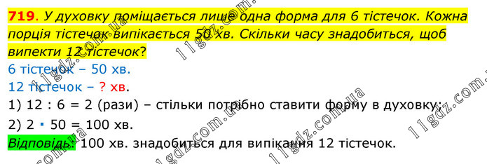 У духовку поміщається лише одна форма для 6 тістечок. Кожна порція тістечок випікається 50 хв. Скільки часу знадобиться, щоб випекти 12 тістечок? 6 тістечок – 50 хв. 12 тістечок – ? хв. 1) 12 : 6 = 2 (рази) – стільки потрібно ставити форму в духовку; 2) 2 ∙ 50 = 100 хв. Відповідь: 100 хв. знадобиться для випікання 12 тістечок.