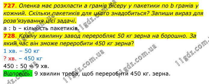 727. Оленка має розкласти а грамів бісеру у пакетики по b грамів у кожний. Скільки пакетиків для цього знадобиться? Запиши вираз для розв’язування цієї задачі. a : b – кількість пакетиків. 728. Кожну хвилину завод переробляє 50 кг зерна на борошно. За який час він зможе переробити 450 кг зерна? 1 хв. – 50 кг ? хв. – 450 кг 450 : 50 = 9 хв. Відповідь: 9 хвилин треба, щоб переробити 450 кг. зерна.