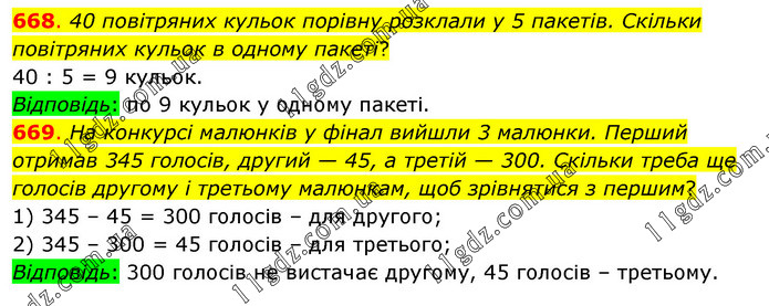 668. 40 повітряних кульок порівну розклали у 5 пакетів. Скільки повітряних кульок в одному пакеті? 40 : 5 = 9 кульок. Відповідь: по 9 кульок у одному пакеті. 669. На конкурсі малюнків у фінал вийшли 3 малюнки. Перший отримав 345 голосів, другий — 45, а третій — 300. Скільки треба ще голосів другому і третьому малюнкам, щоб зрівнятися з першим? 1) 345 – 45 = 300 голосів – для другого; 2) 345 – 300 = 45 голосів – для третього; Відповідь: 300 голосів не вистачає другому, 45 голосів – третьому.