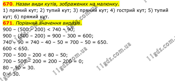 670. Назви види кутів, зображених на малюнку. 1) прямий кут; 2) тупий кут; 3) прямий кут; 4) гострий кут; 5) тупий кут; 6) прямий кут. 671. Порівняй значення виразів. 900 – (500 – 200) < 740 – 90; 900 – (500 – 200) = 900 – 300 = 600; 740 – 90 = 740 – 40 – 50 = 700 – 50 = 650. 600 < 650. 700 – 500 – 200 < 80 – 50; 700 – 500 – 200 = 200 – 200 = 0; 80 – 50 = 30. 0 < 30.