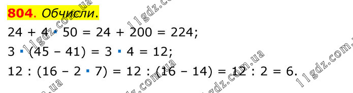 Обчисли. 24 + 4 ∙ 50 = 24 + 200 = 224; 3 ∙ (45 – 41) = 3 ∙ 4 = 12; 12 : (16 – 2 ∙ 7) = 12 : (16 – 14) = 12 : 2 = 6.