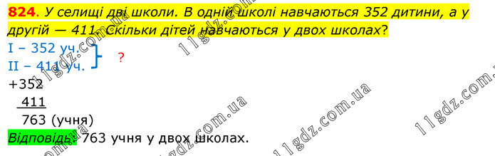 У селищі дві школи. В одній школі навчаються 352 дитини, а у другій — 411. Скільки дітей навчаються у двох школах? Відповідь: 763 учня у двох школах.