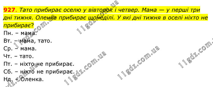 Тато прибирає оселю у вівторок і четвер. Мама — у перші три дні тижня. Оленка прибирає щонеділі. У які дні тижня в оселі ніхто не прибирає? Пн. – мама. Вт. – мама, тато. Ср. – мама. Чт. – тато. Пт. – ніхто не прибирає. Сб. – ніхто не прибирає. Нд. – Оленка.