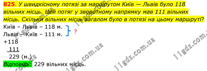У швидкісному потязі за маршрутом Київ — Львів було 118 вільних місць. Цей потяг у зворотному напрямку мав 111 вільних місць. Скільки вільних місць загалом було в потязі на цьому маршруті? Київ – Львів – 118 м. Львів – Київ – 111 м. Відповідь: 229 вільних місць.
