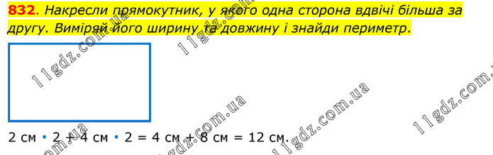 Накресли прямокутник, у якого одна сторона вдвічі більша за другу. Виміряй його ширину та довжину і знайди периметр. 2 см ∙ 2 + 4 см ∙ 2 = 4 см + 8 см = 12 см.