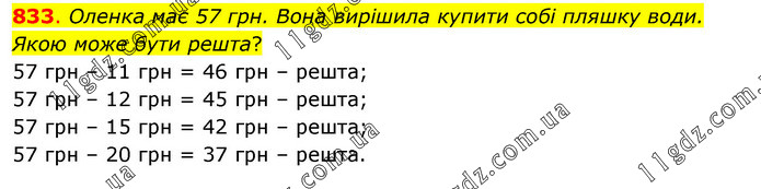 Оленка має 57 грн. Вона вирішила купити собі пляшку води. Якою може бути решта? 57 грн – 11 грн = 46 грн – решта; 57 грн – 12 грн = 45 грн – решта; 57 грн – 15 грн = 42 грн – решта; 57 грн – 20 грн = 37 грн – решта.