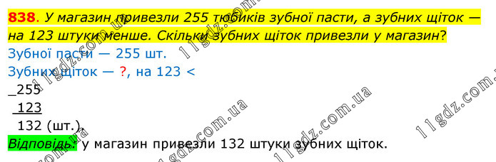 У магазин привезли 255 тюбиків зубної пасти, а зубних щіток — на 123 штуки менше. Скільки зубних щіток привезли у магазин? Зубної пасти — 255 шт. Зубних щіток — ?, на 123 < Відповідь: у магазин привезли 132 штуки зубних щіток.