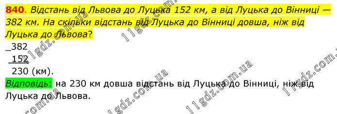 Відстань від Львова до Луцька 152 км, а від Луцька до Вінниці — 382 км. На скільки відстань від Луцька до Вінниці довша, ніж від Луцька до Львова? Відповідь: на 230 км довша відстань від Луцька до Вінниці, ніж від Луцька до Львова.