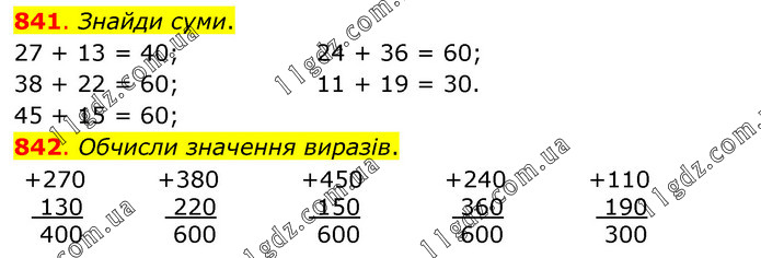 Знайди суми. 27 + 13 = 40; 38 + 22 = 60; 45 + 15 = 60; 24 + 36 = 60; 11 + 19 = 30.