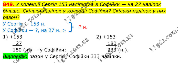 У колекції Сергія 153 наліпки, а в Софійки — на 27 наліпок більше. Скільки наліпок у колекції Софійки? Скільки наліпок у них разом? У Сергія — 153 н. У Софійки — ?, на 27 н. > Відповідь: разом у Сергія і Софійки 333 наліпки.