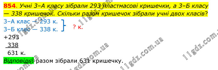 Учні 3–А класу зібрали 293 пластмасові кришечки, а 3–Б класу — 338 кришечок. Скільки разом кришечок зібрали учні двох класів? 3–А клас — 293 к. 3–Б клас — 338 к. Відповідь: разом зібрали 631 кришечку.