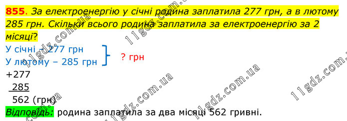 За електроенергію у січні родина заплатила 277 грн, а в лютому 285 грн. Скільки всього родина заплатила за електроенергію за 2 місяці? У січні – 277 грн У лютому – 285 грн Відповідь: родина заплатила за два місяці 562 гривні.