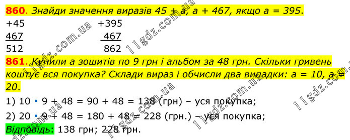 Знайди значення виразів 45 + а, а + 467, якщо а = 395. 861. Купили а зошитів по 9 грн і альбом за 48 грн. Скільки гривень коштує вся покупка? Склади вираз і обчисли два випадки: а = 10, а = 20. 1) 10 ∙ 9 + 48 = 90 + 48 = 138 (грн) – уся покупка; 2) 20 ∙ 9 + 48 = 180 + 48 = 228 (грн.) – уся покупка; Відповідь: 138 грн; 228 грн.