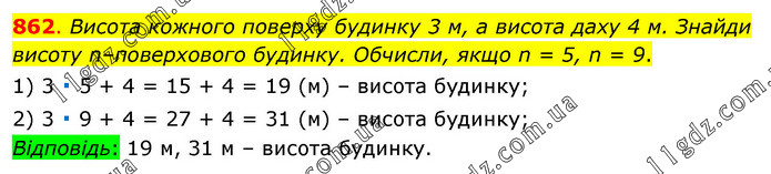 Висота кожного поверху будинку 3 м, а висота даху 4 м. Знайди висоту n–поверхового будинку. Обчисли, якщо n = 5, n = 9. 1) 3 ∙ 5 + 4 = 15 + 4 = 19 (м) – висота будинку; 2) 3 ∙ 9 + 4 = 27 + 4 = 31 (м) – висота будинку; Відповідь: 19 м, 31 м – висота будинку.