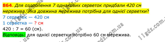 Для оздоблення 7 однакових серветок придбали 420 см мережива. Яка довжина мережива потрібна для однієї серветки? 7 серветок — 420 см 1 серветка — ? см 420 : 7 = 60 (см). Відповідь: для однієї серветки потрібно 60 см мережива.