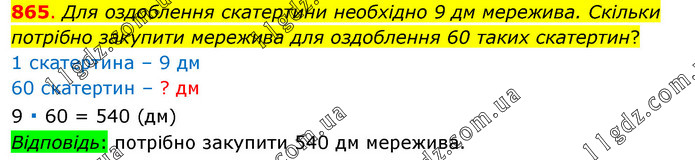Для оздоблення скатертини необхідно 9 дм мережива. Скільки потрібно закупити мережива для оздоблення 60 таких скатертин? 1 скатертина – 9 дм 60 скатертин – ? дм 9 ∙ 60 = 540 (дм) Відповідь: потрібно закупити 540 дм мережива.