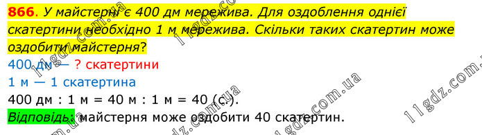 У майстерні є 400 дм мережива. Для оздоблення однієї скатертини необхідно 1 м мережива. Скільки таких скатертин може оздобити майстерня? 400 дм — ? скатертини 1 м — 1 скатертина 400 дм : 1 м = 40 м : 1 м = 40 (с.). Відповідь: майстерня може оздобити 40 скатертин.