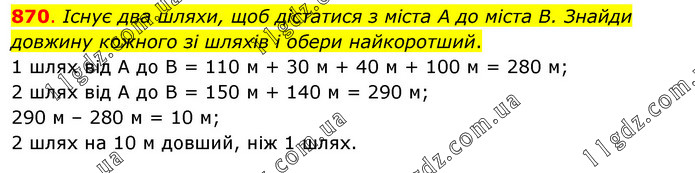 Існує два шляхи, щоб дістатися з міста А до міста В. Знайди довжину кожного зі шляхів і обери найкоротший. 1 шлях від А до В = 110 м + 30 м + 40 м + 100 м = 280 м; 2 шлях від А до В = 150 м + 140 м = 290 м; 290 м – 280 м = 10 м; 2 шлях на 10 м довший, ніж 1 шлях.
