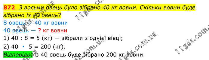 З восьми овець було зібрано 40 кг вовни. Скільки вовни буде зібрано із 40 овець? 8 овець — 40 кг вовни 40 овець — ? кг вовни 1) 40 : 8 = 5 (кг) — зібрали з однієї вівці; 2) 40 ∙ 5 = 200 (кг). Відповідь: із 40 овець буде зібрано 200 кг вовни