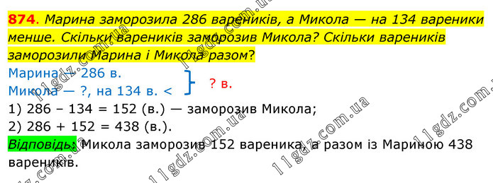 Марина заморозила 286 вареників, а Микола — на 134 вареники менше. Скільки вареників заморозив Микола? Скільки вареників заморозили Марина і Микола разом? Марина — 286 в. Микола — ?, на 134 в. < 1) 286 – 134 = 152 (в.) — заморозив Микола; 2) 286 + 152 = 438 (в.). Відповідь: Микола заморозив 152 вареника, а разом із Мариною 438 вареників.