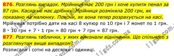 876. Розглянь випадок. Мрійниця має 200 грн і хоче купити пенал за 87 грн. Касир не має дрібних. Мрійниця розміняла 200 грн, як показано на малюнку. Поясни, як вона тепер розрахується на касі. Мрійниця потрібно дати на касі 8 купюр по 10 грн і 7 монет по 1 грн. 8 ∙ 10 грн + 7 ∙ 1 грн = 80 грн + 7 грн = 87 грн. 877. Розглянь таблички, у яких виконали віднімання. Що спільного з розглянутим вище випадком? Розписали і сотні на десятки і одиниці.