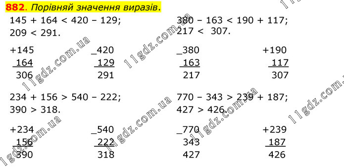 Порівняй значення виразів. 145 + 164 < 420 – 129; 209 < 291. 380 – 163 < 190 + 117; 217 < 307. 234 + 156 > 540 – 222; 390 > 318. 770 – 343 > 239 + 187; 427 > 426.