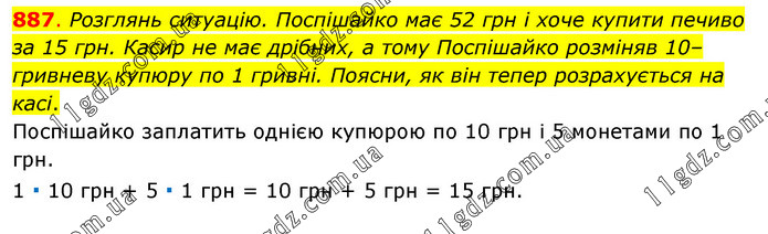 Розглянь ситуацію. Поспішайко має 52 грн і хоче купити печиво за 15 грн. Касир не має дрібних, а тому Поспішайко розміняв 10–гривневу купюру по 1 гривні. Поясни, як він тепер розрахується на касі. Поспішайко заплатить однією купюрою по 10 грн і 5 монетами по 1 грн. 1 ∙ 10 грн + 5 ∙ 1 грн = 10 грн + 5 грн = 15 грн.