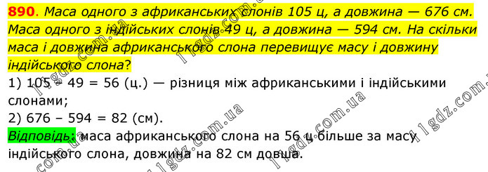 Маса одного з африканських слонів 105 ц, а довжина — 676 см. Маса одного з індійських слонів 49 ц, а довжина — 594 см. На скільки маса і довжина африканського слона перевищує масу і довжину індійського слона? 1) 105 – 49 = 56 (ц.) — різниця між африканськими і індійськими слонами; 2) 676 – 594 = 82 (см). Відповідь: маса африканського слона на 56 ц більше за масу індійського слона, довжина на 82 см довша.