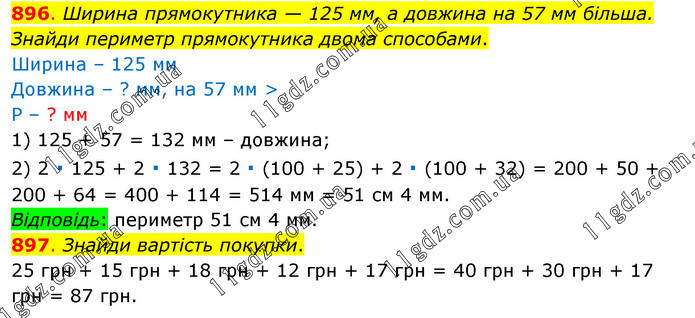 896. Ширина прямокутника — 125 мм, а довжина на 57 мм більша. Знайди периметр прямокутника двома способами. Ширина – 125 мм Довжина – ? мм, на 57 мм > Р – ? мм 1) 125 + 57 = 132 мм – довжина; 2) 2 ∙ 125 + 2 ∙ 132 = 2 ∙ (100 + 25) + 2 ∙ (100 + 32) = 200 + 50 + 200 + 64 = 400 + 114 = 514 мм = 51 см 4 мм. Відповідь: периметр 51 см 4 мм. 897. Знайди вартість покупки. 25 грн + 15 грн + 18 грн + 12 грн + 17 грн = 40 грн + 30 грн + 17 грн = 87 грн.