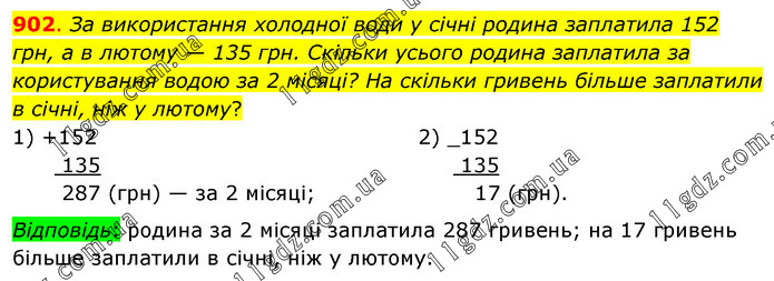 За використання холодної води у січні родина заплатила 152 грн, а в лютому — 135 грн. Скільки усього родина заплатила за користування водою за 2 місяці? На скільки гривень більше заплатили в січні, ніж у лютому? Відповідь: родина за 2 місяці заплатила 287 гривень; на 17 гривень більше заплатили в січні, ніж у лютому.