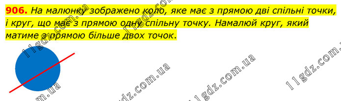 На малюнку зображено коло, яке має з прямою дві спільні точки, і круг, що має з прямою одну спільну точку. Намалюй круг, який матиме з прямою більше двох точок.