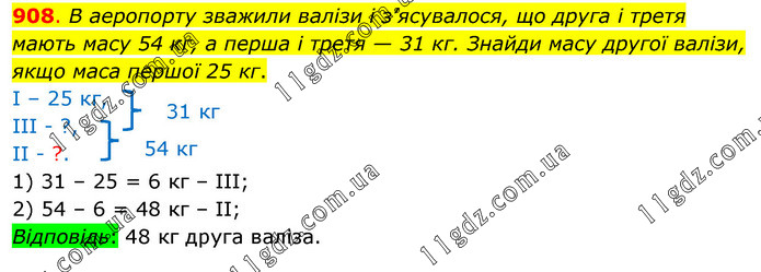 В аеропорту зважили валізи і з’ясувалося, що друга і третя мають масу 54 кг, а перша і третя — 31 кг. Знайди масу другої валізи, якщо маса першої 25 кг. І – 25 кг, ІІІ - ?, ІІ - ?. 1) 31 – 25 = 6 кг – ІІІ; 2) 54 – 6 = 48 кг – ІІ; Відповідь: 48 кг друга валіза.