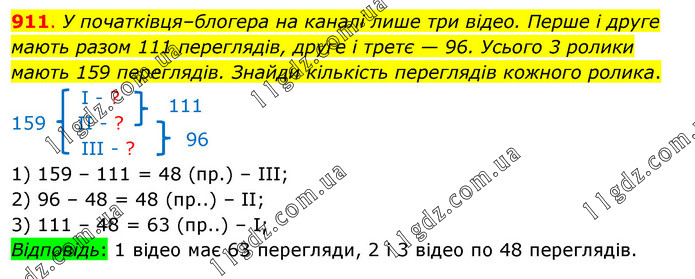 У початківця–блогера на каналі лише три відео. Перше і друге мають разом 111 переглядів, друге і третє — 96. Усього 3 ролики мають 159 переглядів. Знайди кількість переглядів кожного ролика. І - ? 159 ІІ - ? ІІІ - ? 1) 159 – 111 = 48 (пр.) – ІІІ; 2) 96 – 48 = 48 (пр..) – ІІ; 3) 111 – 48 = 63 (пр..) – І; Відповідь: 1 відео має 63 перегляди, 2 і 3 відео по 48 переглядів.