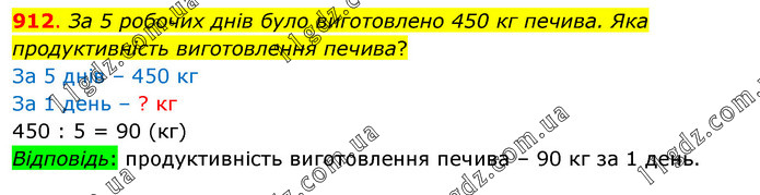 За 5 робочих днів було виготовлено 450 кг печива. Яка продуктивність виготовлення печива? За 5 днів – 450 кг За 1 день – ? кг 450 : 5 = 90 (кг) Відповідь: продуктивність виготовлення печива – 90 кг за 1 день.