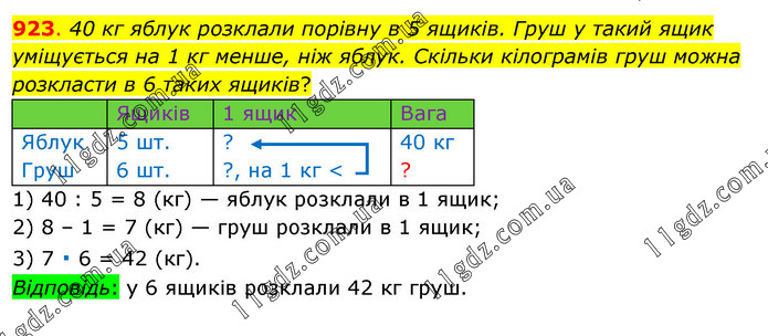 40 кг яблук розклали порівну в 5 ящиків. Груш у такий ящик уміщується на 1 кг менше, ніж яблук. Скільки кілограмів груш можна розкласти в 6 таких ящиків? 1) 40 : 5 = 8 (кг) — яблук розклали в 1 ящик; 2) 8 – 1 = 7 (кг) — груш розклали в 1 ящик; 3) 7 ∙ 6 = 42 (кг). Відповідь: у 6 ящиків розклали 42 кг груш.