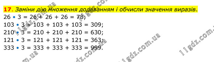 Заміни дію множення додаванням і обчисли значення виразів. 26 • 3 = 26 + 26 + 26 = 78; 103 • 3 = 103 + 103 + 103 = 309; 210 • 3 = 210 + 210 + 210 = 630; 121 • 3 = 121 + 121 + 121 = 363; 333 • 3 = 333 + 333 + 333 = 999.