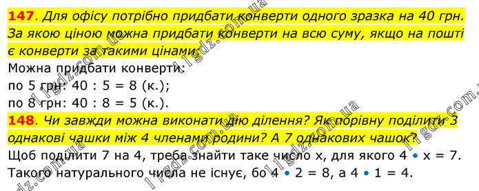 147. Для офісу потрібно придбати конверти одного зразка на 40 грн. За якою ціною можна придбати конверти на всю суму, якщо на пошті є конверти за такими цінами: Можна придбати конверти: по 5 грн: 40 : 5 = 8 (к.); по 8 грн: 40 : 8 = 5 (к.). 148. Чи завжди можна виконати дію ділення? Як порівну поділити 3 однакові чашки між 4 членами родини? А 7 однакових чашок? Щоб поділити 7 на 4, треба знайти таке число х, для якого 4 • х = 7. Такого натурального числа не існує, бо 4 • 2 = 8, а 4 • 1 = 4.