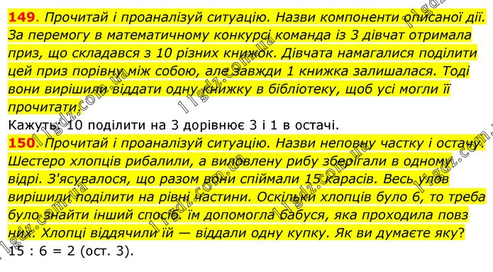 149. Прочитай і проаналізуй ситуацію. Назви компоненти описаної дії. За перемогу в математичному конкурсі команда із 3 дівчат отримала приз, що складався з 10 різних книжок. Дівчата намагалися поділити цей приз порівну між собою, але завжди 1 книжка залишалася. Тоді вони вирішили віддати одну книжку в бібліотеку, щоб усі могли її прочитати. Кажуть: 10 поділити на 3 дорівнює 3 і 1 в остачі. 150. Прочитай і проаналізуй ситуацію. Назви неповну частку і остачу. Шестеро хлопців рибалили, а виловлену рибу зберігали в одному відрі. З'ясувалося, що разом вони спіймали 15 карасів. Весь улов вирішили поділити на рівні частини. Оскільки хлопців було 6, то треба було знайти інший спосіб. їм допомогла бабуся, яка проходила повз них. Хлопці віддячили їй — віддали одну купку. Як ви думаєте яку? 15 : 6 = 2 (ост. 3).
