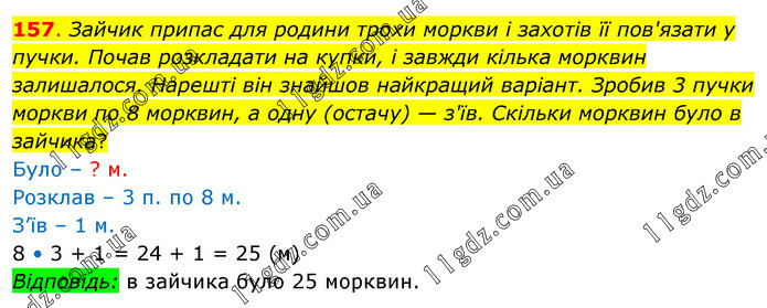 Зайчик припас для родини трохи моркви і захотів її пов'язати у пучки. Почав розкладати на купки, і завжди кілька морквин залишалося. Нарешті він знайшов найкращий варіант. Зробив 3 пучки моркви по 8 морквин, а одну (остачу) — з'їв. Скільки морквин було в зайчика? Було – ? м. Розклав – 3 п. по 8 м. З’їв – 1 м. 8 • 3 + 1 = 24 + 1 = 25 (м) Відповідь: в зайчика було 25 морквин.