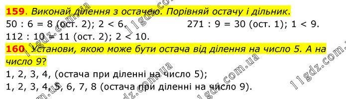 159. Виконай ділення з остачею. Порівняй остачу і дільник. 50 : 6 = 8 (ост. 2); 2 < 6. 112 : 10 = 11 (ост. 2); 2 < 10. 271 : 9 = 30 (ост. 1); 1 < 9. 160. Установи, якою може бути остача від ділення на число 5. А на число 9? 1, 2, 3, 4, (остача при діленні на число 5); 1, 2, 3, 4, 5, 6, 7, 8 (остача при діленні на число 9).